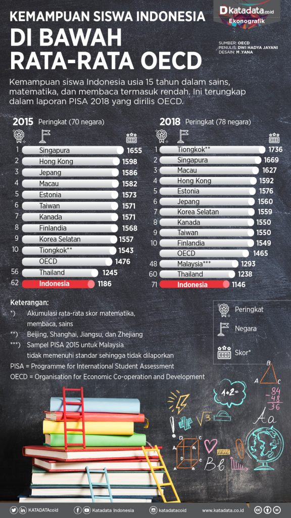 Penelitian Program for International Student Assessment (PISA) tahun 2018 menunjukkan rendahnya tingkat literasi Indonesia dibanding negara-negara di dunia. Skor membaca Indonesia berada pada ranking 72 dari 78 negara yang disurvei.