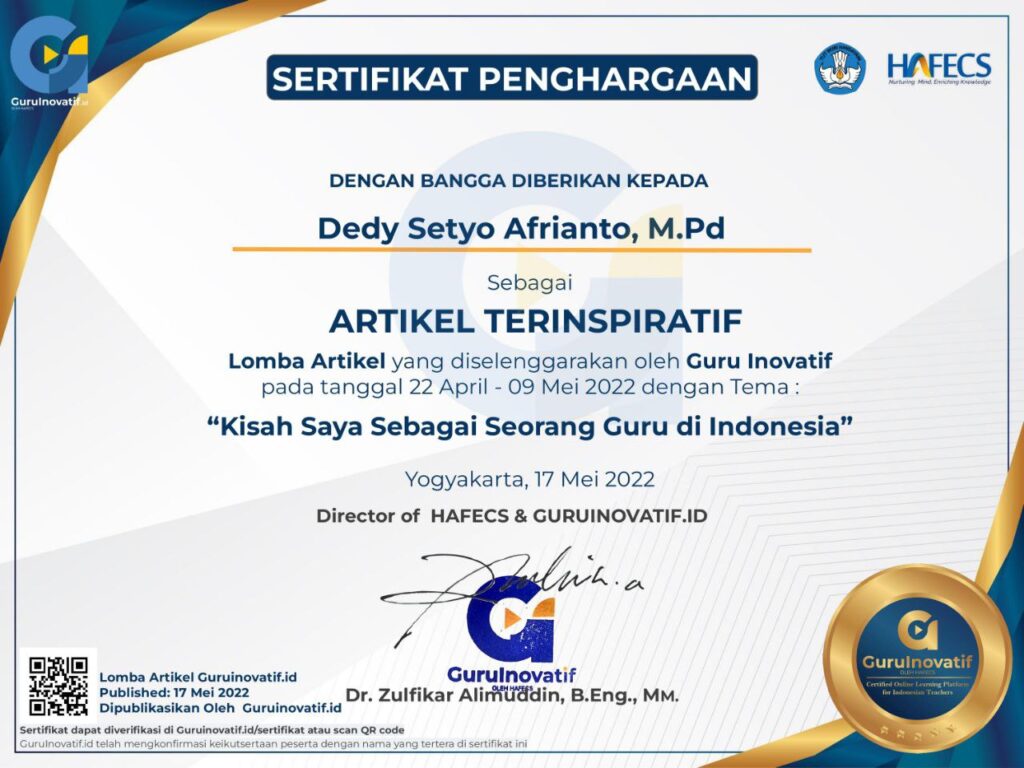 Alhamdulillah, pada helatan lomba penulisan artikel Guru Inovatif 2022 yang diselenggarakan oleh https://guruinovatif.id, tulisan saya yang berjudul “Menyalakan Cahaya di Tengah Hutan” mendapatkan predikat sebagai artikel terinspiratif.
