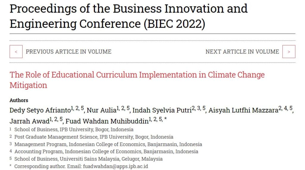 15. Artikel Proceeding berjudul “The Role of Educational Curriculum Implementation in Climate Change Mitigation“. Penerbit Atlantis Press. DOI 10.2991/978-94-6463-144-9_21. URL : https://www.atlantis-press.com/proceedings/biec-22/125986688