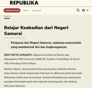 16. Artikel Opini Populer Harian Nasional Republika “Belajar Keabadian dari Negeri Samurai”, publish tanggal 27 Mei 2023. Dapat dibaca pada URL https://republika.id/posts/41273/belajar-keabadian-dari-negeri-samurai